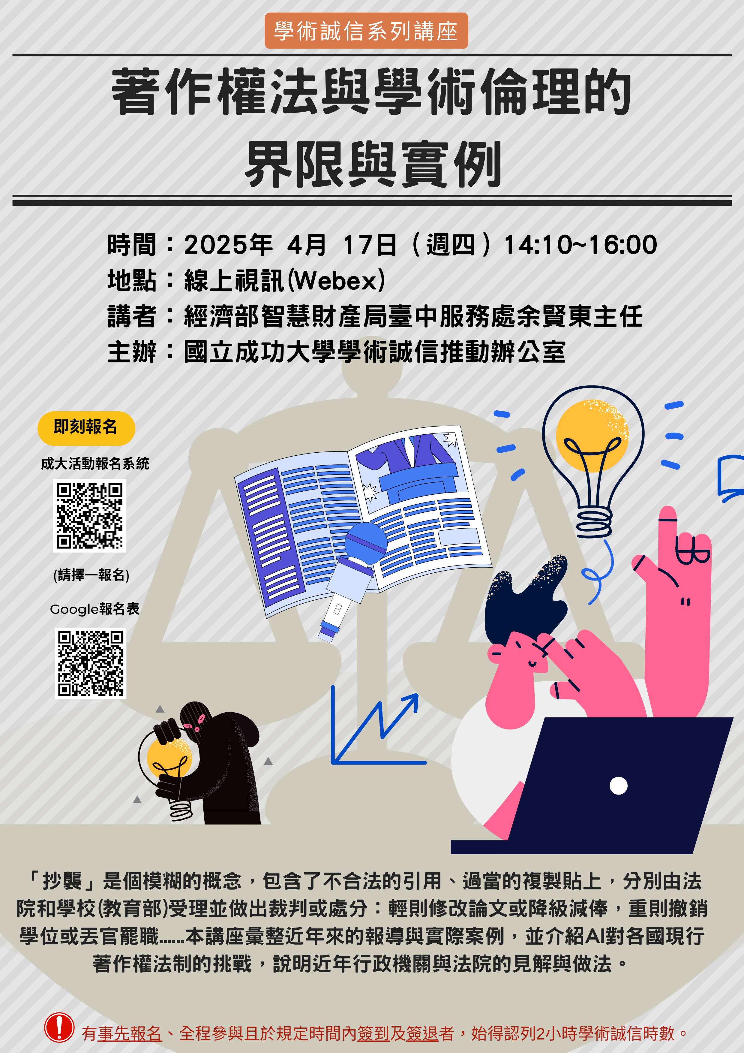 【國立成功大學演講訊息】114年4月17日「著作權法與學術倫理的界限與實例」